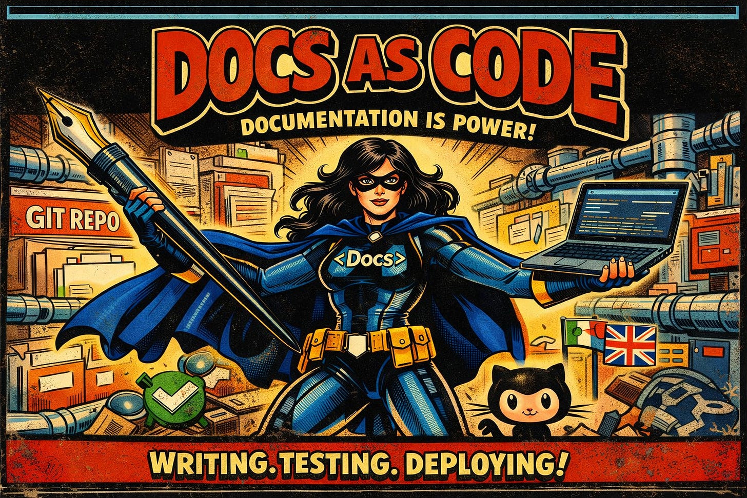 La idea és senzilla però potent: tractar la documentació com si fos codi. Escriure manuals i guies dins de repositoris Git, gestionar els canvis amb pull requests, fer revisió entre persones de l’equip i automatitzar validacions i publicacions amb pipelines. Això fa que el contingut no es despenji mai del que realment passa al projecte, es manté viu i revisat, i tothom el pot millorar amb el mateix flux que una línia de Python o una funció nova.